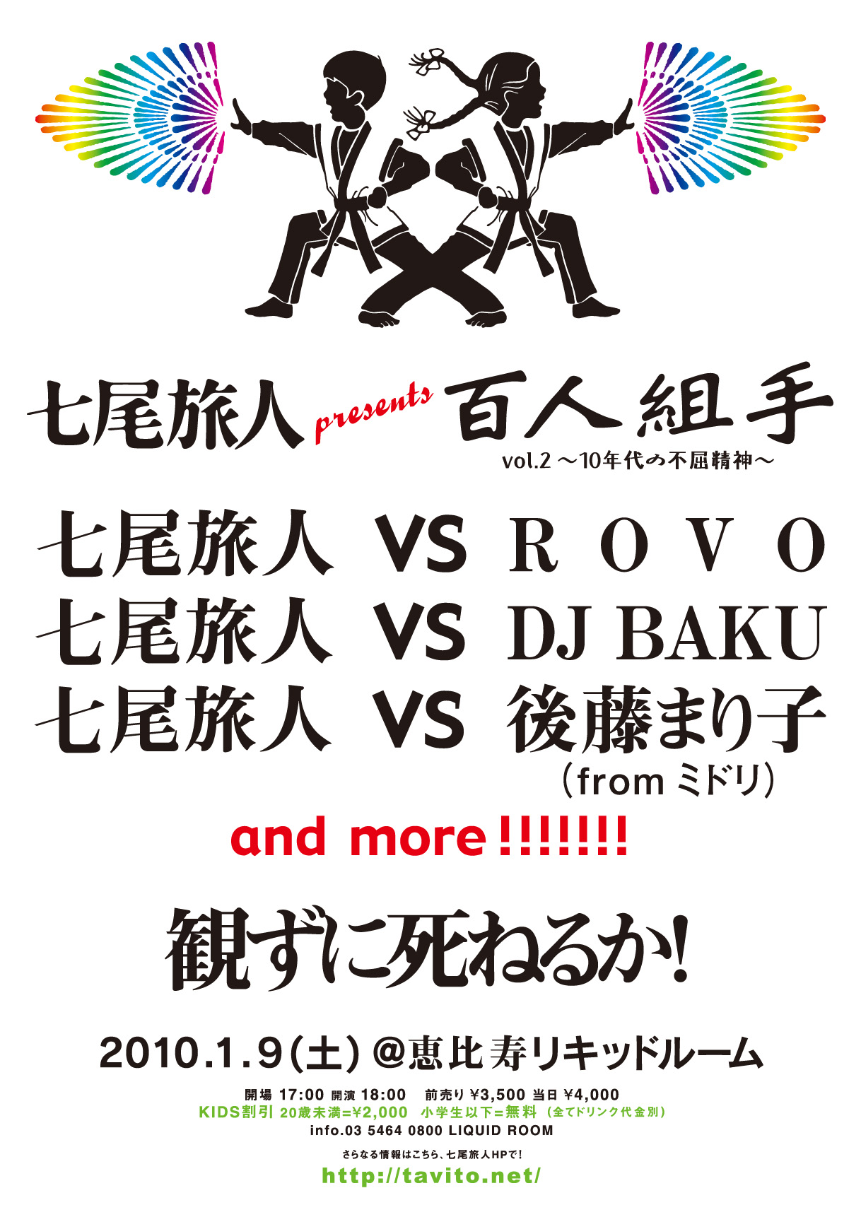 ![]() 会場:恵比寿リキッドルーム =出演= 七尾旅人 VS ROVO 七尾旅人 VS DJ BAKU 七尾旅人 VS 後藤まりこ(fromミドリ) =飛び入り参戦!!= 七尾旅人 VS 鶴見済 七尾旅人 VS サイプレス上野 DJ:やけのはら and more!!!!!!! ![]() ![]() ![]() ![]() ![]() ![]() ![]() ![]() ![]() |